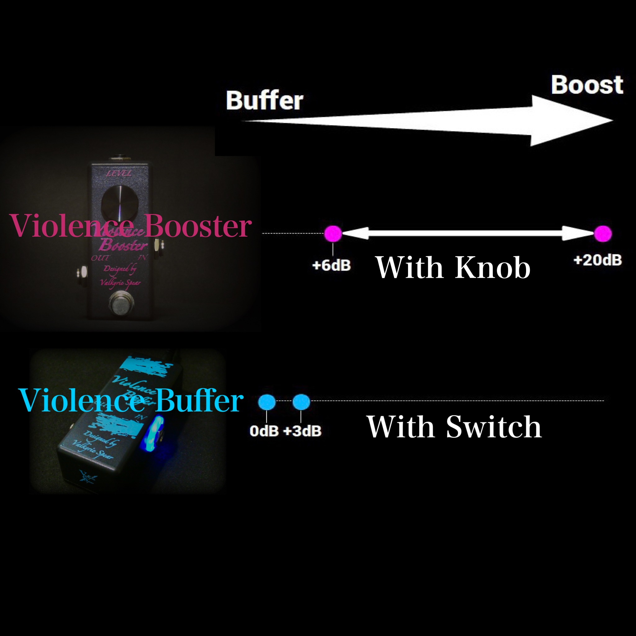 Violence Buffer(バッファー)はViolence Booster MK II(ブースター)のサウンドをベースに設計してますので全体的な音の傾向は似てきます。- 違いの部分を簡単に言いますと、