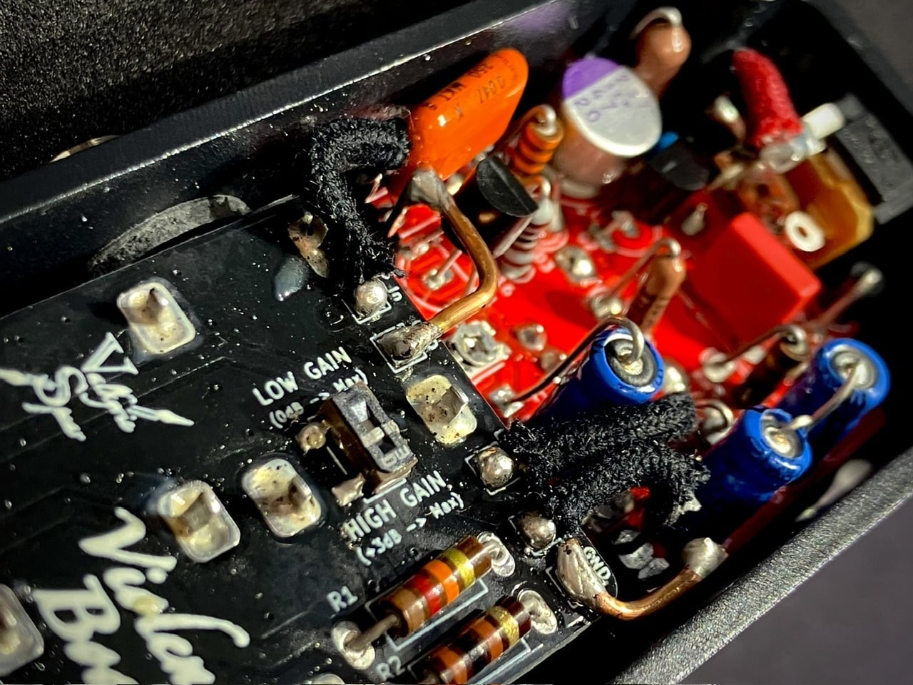 当ペダルはつまみを下げて使用することでバッファーとしても使用可能です。その際、完全なユニティゲイン(0dB)のバッファーとして動作させたい場合のみ、ケース内部のゲイン切替DIPスイッチをLow Gain(0dB)側に切り替えてお使いください。
